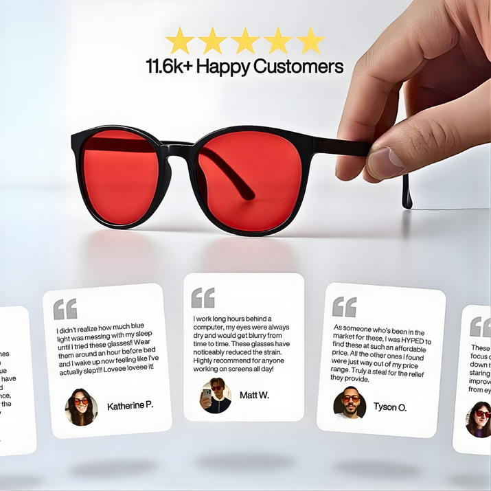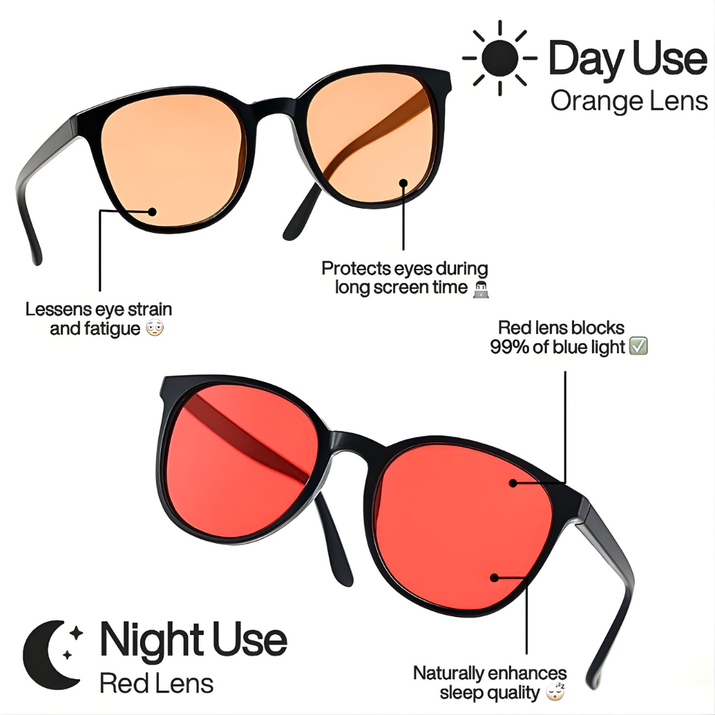 Red-lens glasses are ideal for evening and nighttime use, typically 1–2 hours before bed. They block up to 99% of blue light, helping your brain naturally wind down and produce melatonin — leading to deeper, faster sleep.
